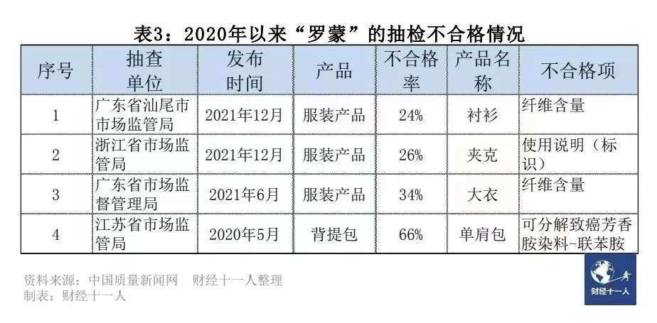 在2020年以来各地市场监管部门组织的产品质量监督抽查中,“罗蒙”有4次被检出产品不合格,涉及衬衫、夹克、大衣以单肩包。生产企业皆为罗蒙集团的子公司——宁波罗蒙制衣有限公司。