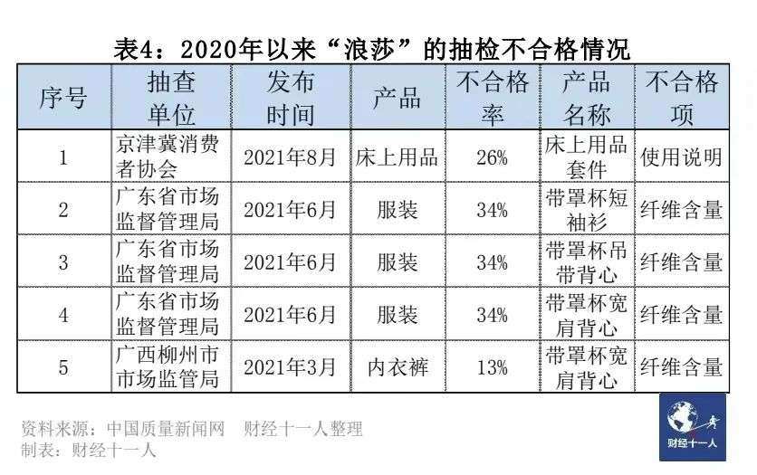 在2020年以来各地市场监管部门组织的质量监督抽查中,“浪莎”有5次被检出产品不合格,涉及床上用品、短袖衫、女士背心。