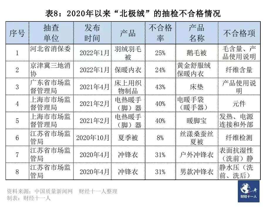 在2020年以来各地市场监管部门组织的质量监督抽查及消费者协会检测中,“北极绒”有8次被查出产品不合格,涉及电暖手袋、暖脚宝、蚕丝被、床垫、鹅毛被、保暖内衣及冲锋衣。