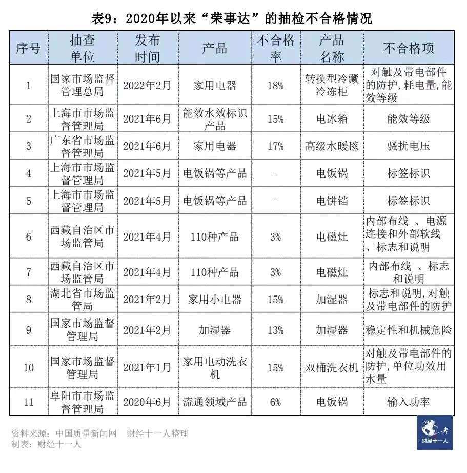 在2020年以来各地市场监管部门组织的质量监督抽查中,“荣事达”有11次被查出产品不合格,涉及冷冻柜、电冰箱、电热毯、电磁灶、电饭锅、电饼铛、加湿器、洗衣机和电饭锅。