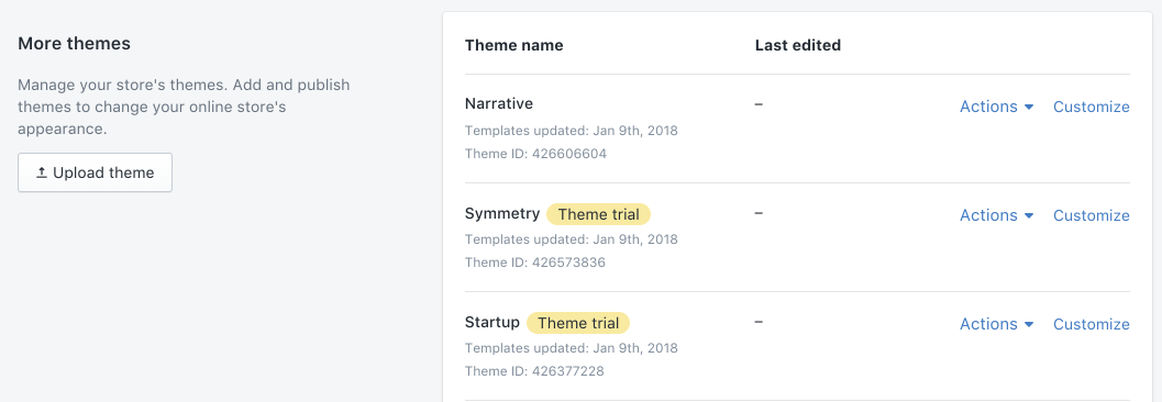 将新模版添加到商店中后,它们显示在 Shopify 模版页面的模版库中。您可以通过将模版发布到您的在线商店来切换新的模版。发布新模版时,旧模版仍会显示在模版库中(如有需要,您可以换回旧模版)。