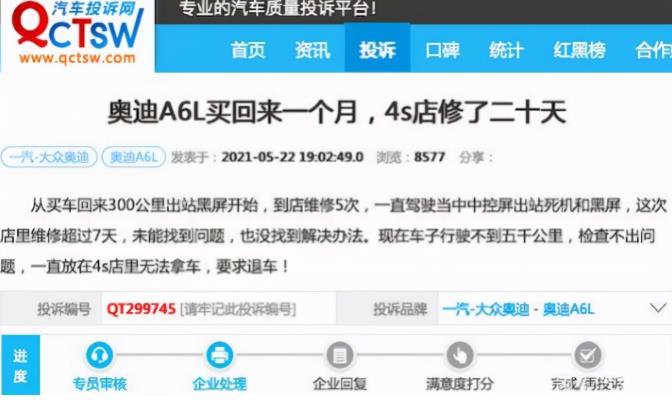 另外还有一点就是,关于奥迪A6L的质量问题。这不,在汽车投诉网中,就接到了一位奥迪A6L车主的投诉,据车主说自己的奥迪A6L买了才一个月,在4S店内就维修了20天。因为中控屏一直死机黑屏,无法正常行驶,所以只好将新车送到售后维修,可维修一个星期也没有找到原因,最后只能返厂升级,再不然就是更换。对此。车主也是非常气愤,自己刚买的新车,开了还不到5千公里,就不能开了。