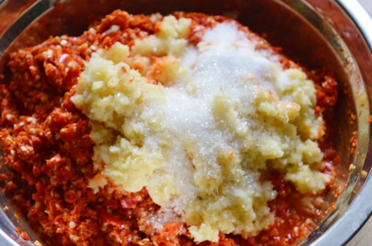 第四步、加入适量食盐、白糖,用手把调料翻拌均匀。盐和辣椒的比例是20:1,而食盐和白糖的比例是2:1。