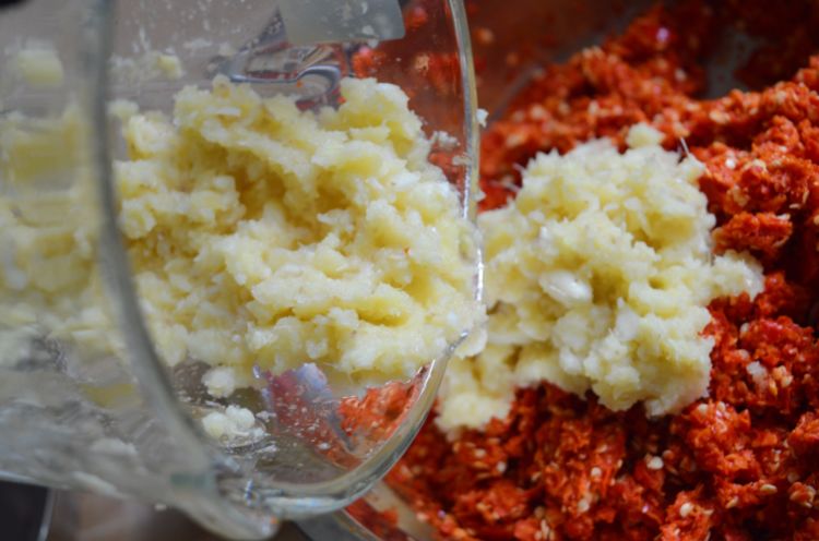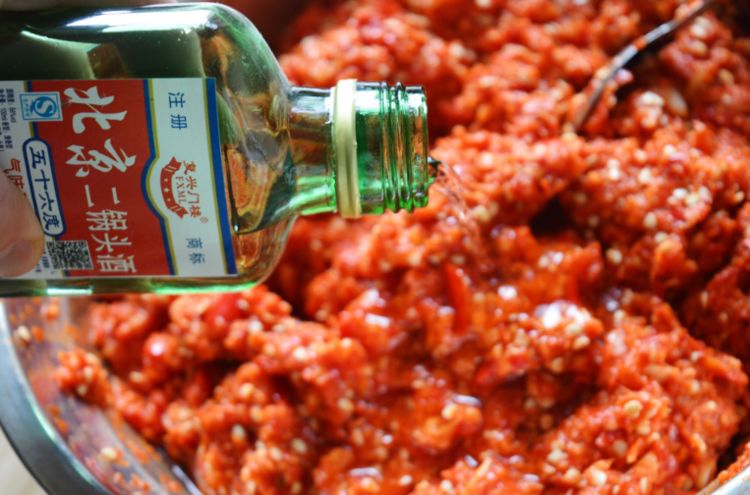 第五步、倒入小半碗高度白酒,最好用粮食酒,而且是52°以上,再次用手翻拌均匀。粮食酒经过发酵,富含多种芳香物质,能让剁辣椒的味道更香。酒精度高,防腐杀菌的效果就更好,剁辣椒的保存时间更长。