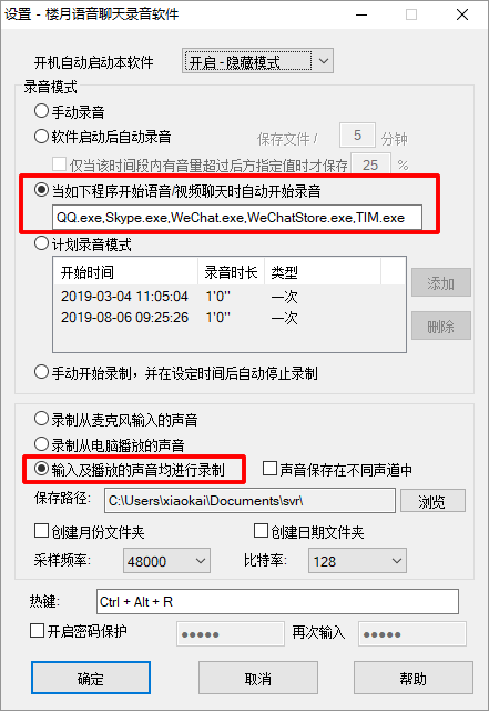 7,如果与好友并不是通过发送QQ语音消息,而是通过语音或视频即时聊天的方式进行聊天的话,可将楼月语音聊天录音软件设置为“当如下程序开始语音/视频聊天时自动开始录音”,并在下方设置为“输入及播放的声音均进行录制”,这样,软件可以自动对该电脑上的QQ语音聊天进行双边录音。