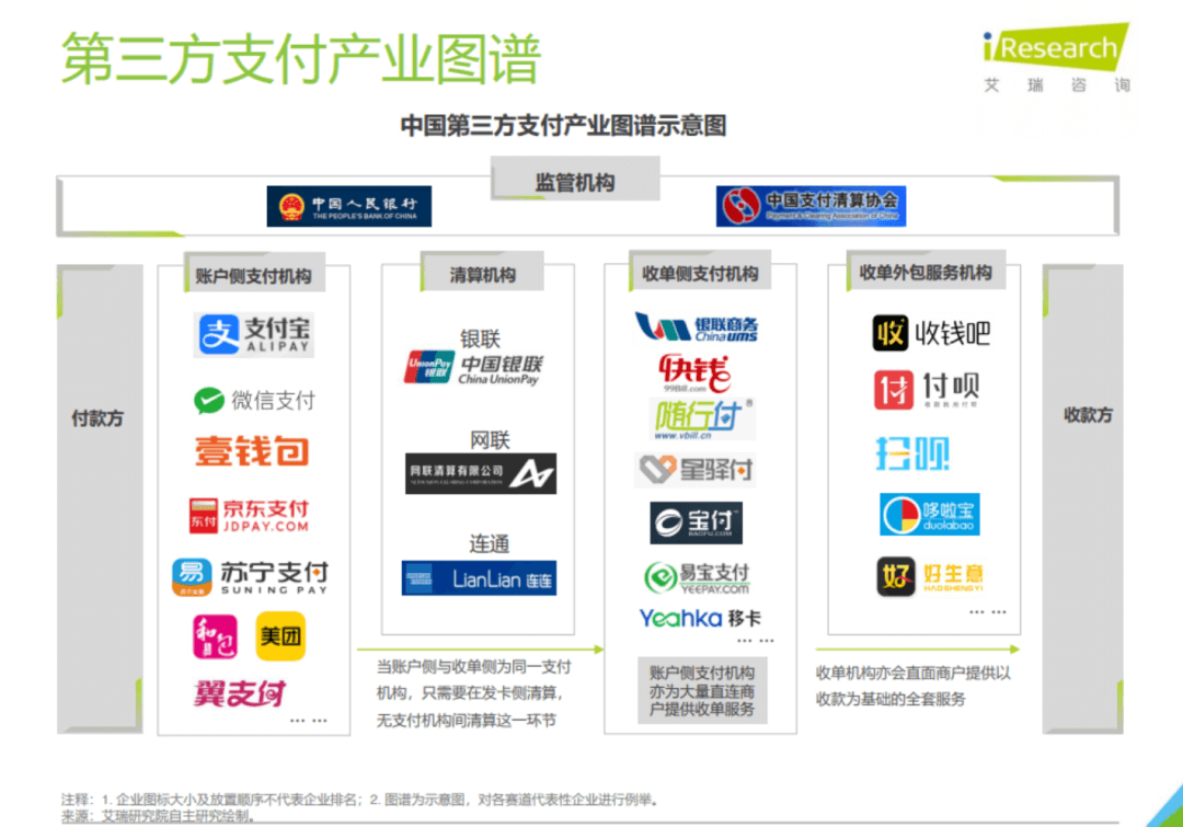 从大的行业分类来看,拉卡拉的主营业务属于第三方支付范畴。中国的第三方支付行业可分为账户侧与收单侧两类,账户侧以支付宝、微信支付等为代表,主要承担类银行卡功能,留存用户资金并进行用户侧资金结算;而收单侧以银联商务、拉卡拉为代表,负责商户侧收单、结算等业务,从中收取一定的手续费,主要通过一些终端产品实现交易,譬如POS机、收银机、码牌等。
