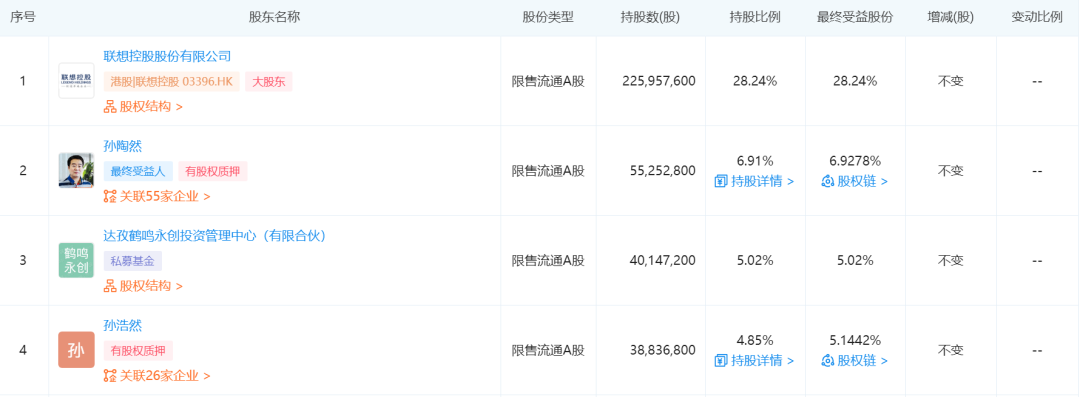 从股权结构来看,孙陶然仅持股6.91%。如果加上其弟孙浩然4.85%的股份,兄弟二人合计持有拉卡拉约11.76%股权,与大股东联想控股28.24%的持股比例相去甚远。