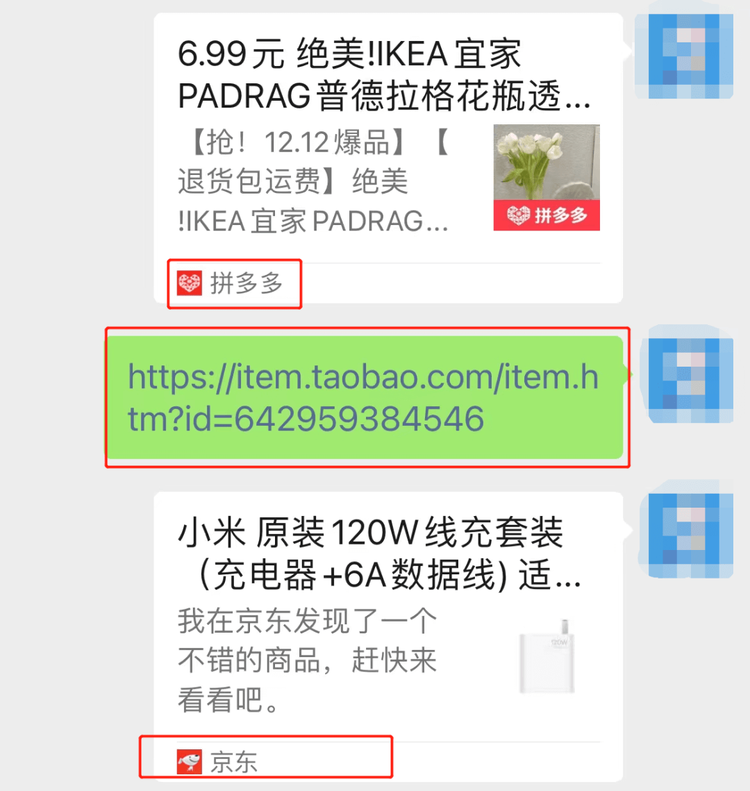 拼多多、淘宝、京东分享到微信的呈现方式不同