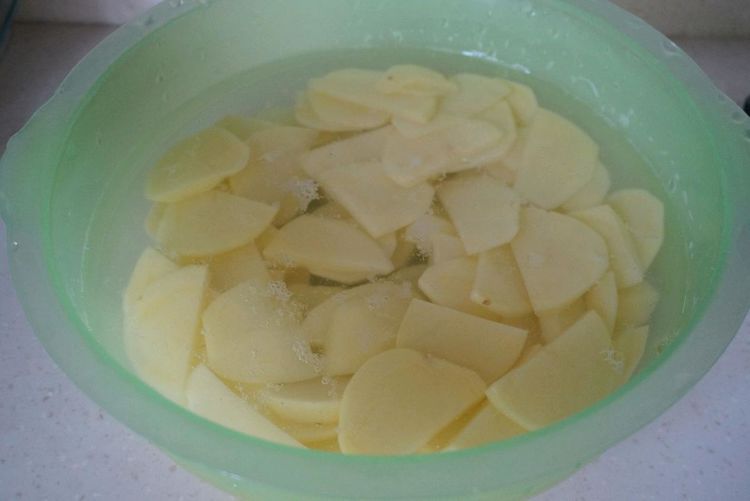 1、将罗宋汤用到的所有食材准备齐全。把土豆去皮切薄片,放入容器里,加入冷水浸泡下。(土豆用水浸泡既能防止氧化,又能去除淀粉。)