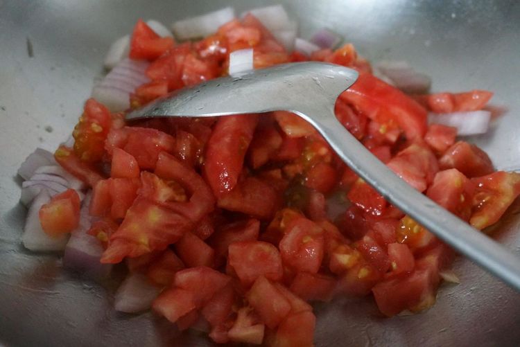 5、锅中加入食用油烧热,然后将切好的洋葱倒进锅中翻炒出香味,随后将切好的西红柿丁也倒进锅中翻炒。