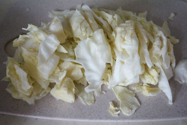 4、将卷心菜清洗干净切块,洋葱去皮切块。