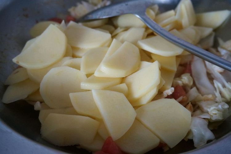 6、下入切好的卷心菜,把土豆也放进锅中一起翻炒。