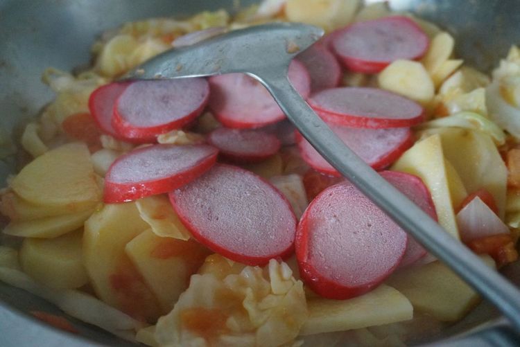 7、切点红肠放进锅中。