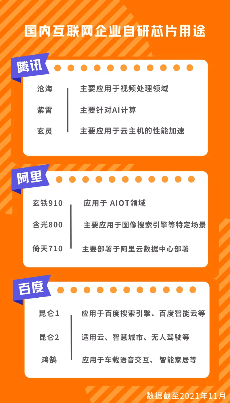 就拿2021年来说,百度宣布昆仑2芯片量产,阿里发布倚天710,腾讯则是一连拿出“紫霄”“沧海”“玄灵”三款芯片。