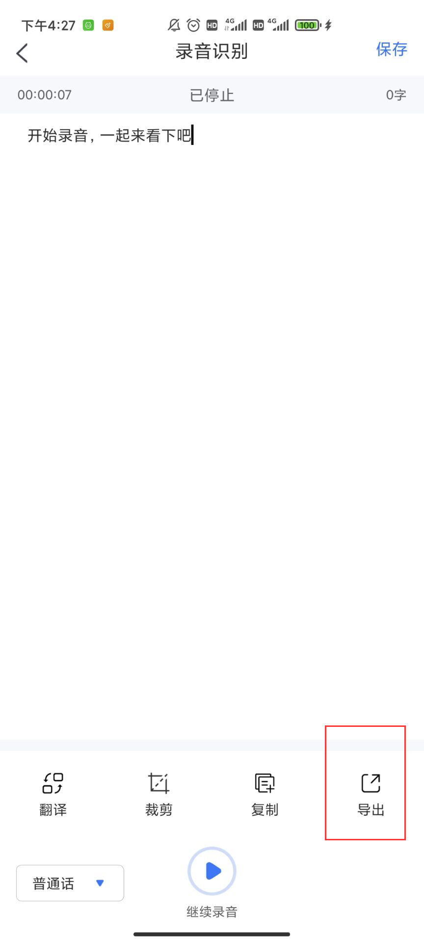 在现场录音结束,我们可以看到上方有录音转成的文字,我们可以点击下方的翻译、复制、导出这些选项对这些文本文字进行处理。也可以直接点击“保存”,这样一来我们录制的音频文件会自动保存在“文件库”啦!