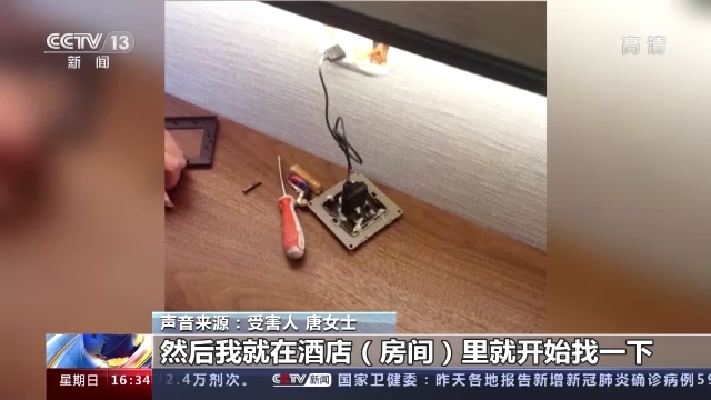 受害人 唐女士:出于好奇,然后我就在酒店里开始找一下,就好玩一样,看到电视机下面有一个插板,怀疑这个应该就是摄像头,然后我就马上打电话到前台,他们也对比,对比后应该就是没错了,我马上就打了110报警,警方百分之百确定是摄像头。