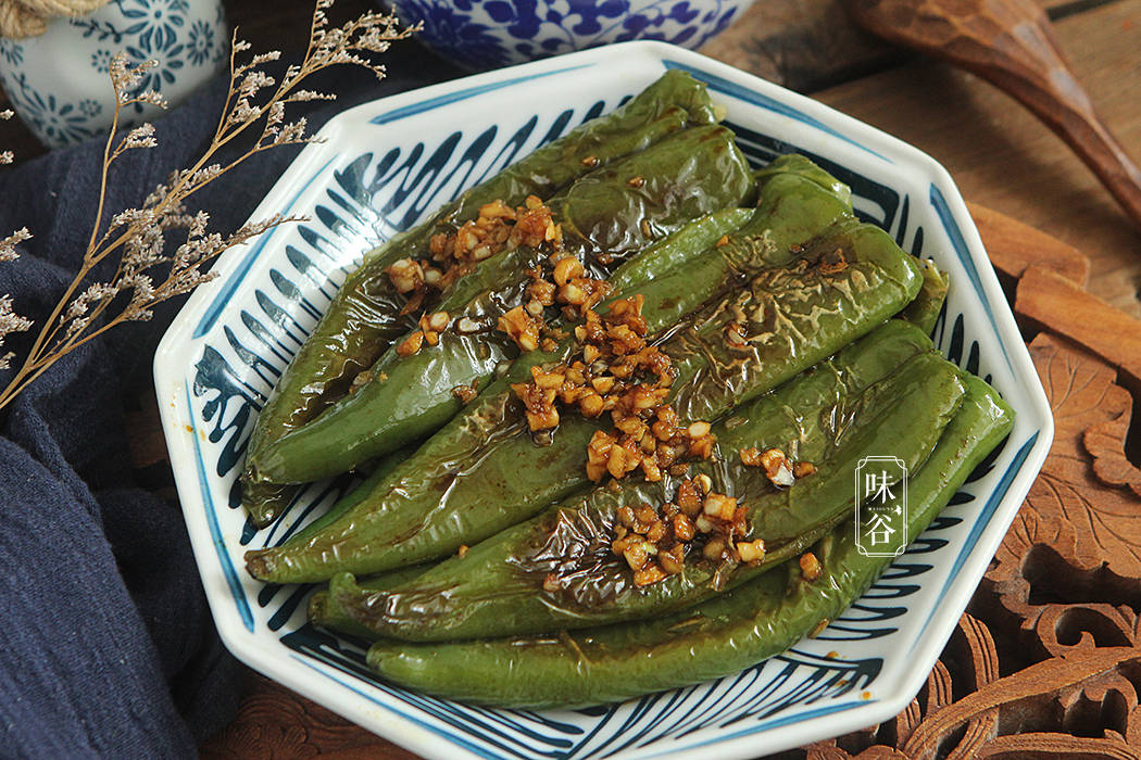 5、直至青椒变软,两面表皮都煸出虎皮皱纹,煎好后放入蒜末,倒入调好的料汁迅速翻炒入味,即可盛入盘中。