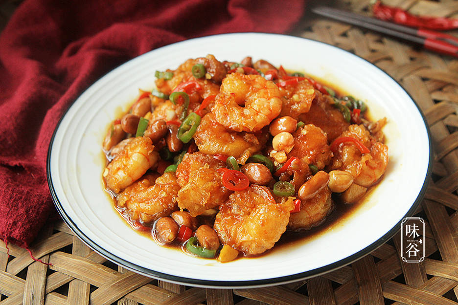 【材料】:鲜虾 500克、炒花生米 适量、青红辣椒 2根、蒜 2瓣、生抽 3汤匙、料酒 半汤匙、香醋 1汤匙、白糖 半茶匙、盐 半茶匙、淀粉 2大匙、淀粉 1茶匙