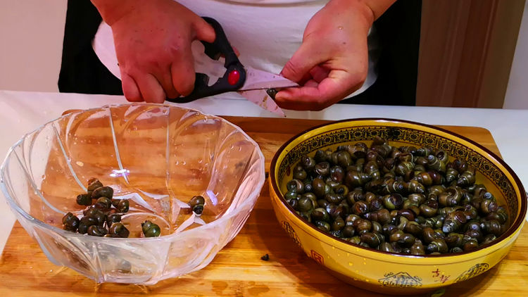 2.将螺蛳多搓洗几遍,特别脏的可以用刷子刷一下,洗净其壳上粘连的海藻和脏东西。然后把螺蛳尾部用剪刀剪掉,做这一步可以让螺蛳更加入味,而且吃的时候更容易吸,不用牙签也能轻松吸出螺蛳肉。
