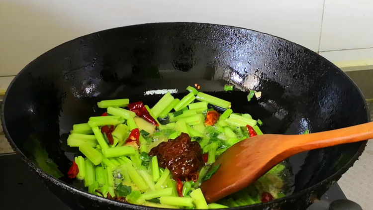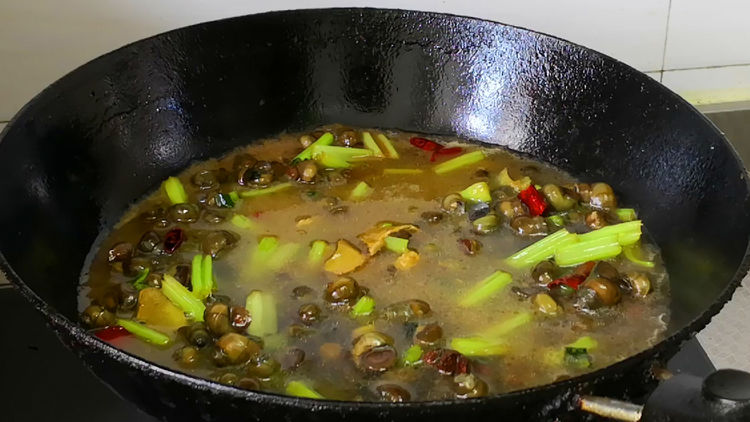 5.锅中加入适量植物油,油温7成热时下入芹菜段,葱花,姜片,小米圈和八角,爆出香味后再加入2勺的豆瓣酱继续翻炒,煸炒出香味后再倒入焯好水的螺蛳,大火翻炒1分钟后再加入适量的料酒去腥,白糖提鲜,生抽,味极鲜适量,翻炒均匀后再加入适量清水,水量没过螺蛳即可,大火炖5~6分钟,因为螺蛳已经焯过水了,所以不需要炖太长时间。