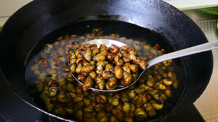6.时间到了以后,我们再加入适量盐调一下底味,翻炒均匀后关火,把螺蛳和煮螺蛳的汤汁一起倒入碗内,这样螺蛳还会继续吸收汤汁,吃的时候连汤汁一起吸到嘴里,会更加鲜美入味。