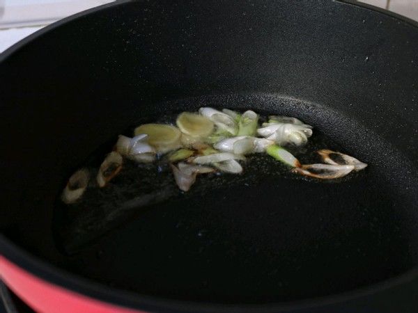 3、锅中倒进少量的亮油,开小火堆油烧开,大约有五成热的情况下,大家就可以把葱和姜倒进锅里边,用铁铲煸炒两下炒成清香味。