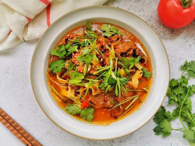 步骤六、牛肉捞出放在碗中,倒入汤汁,放入一勺花椒、一勺芝麻,锅中烧些热油,将热油淋在芝麻上面,放上一些香菜即可。