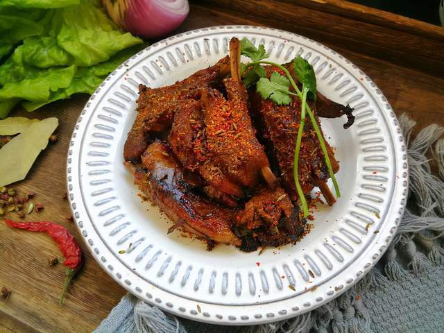 步骤六、烤箱预热200℃,羊排放入烤箱中层,烤20分钟,最后5分钟取出来,撒上一些孜然粉、辣椒粉。