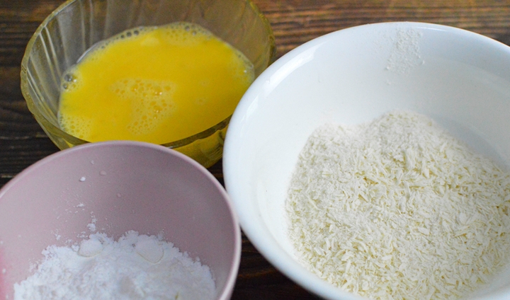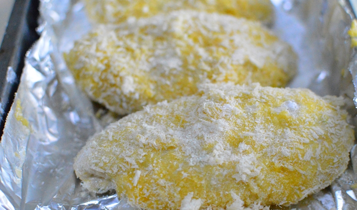 6.手上抹一层油,把土豆泥捏成饼,形状可以随自己喜好来,裹一层生粉,然后裹上鸡蛋液,再放入面包粉中滚一圈,均匀沾上面包粉即可。