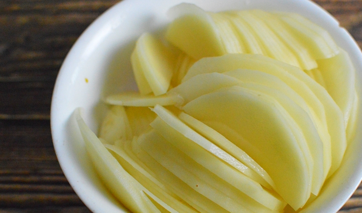【做法】1.土豆先洗净削皮,切成薄片后入锅蒸熟,这里要注意盖上保鲜膜,不能让水蒸气进碗里了。