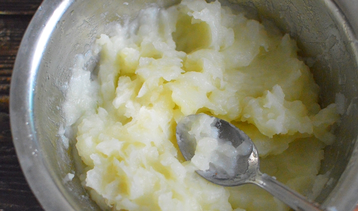 2.蒸好的土豆用勺子压成泥,蒸烂一点比较好。