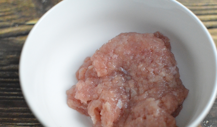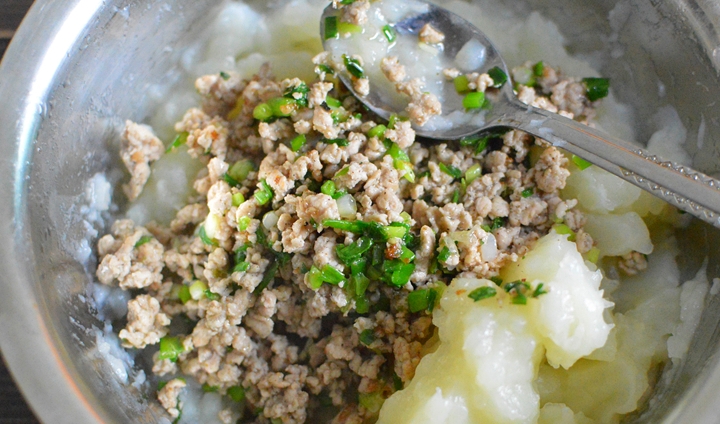5.将炒好的肉末倒入土豆泥中,趁热翻拌均匀,土豆泥冷却后比较粘。