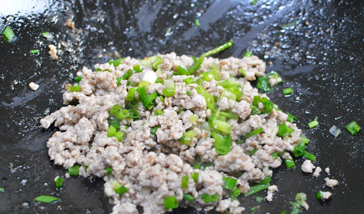 4.锅内倒入适量底油,下入肉末翻炒至变色,再加入葱花翻炒出香味,加入胡椒粉和食盐调味。