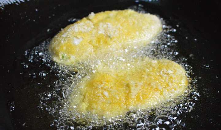 7.起锅烧油,下入土豆饼煎至定型,再用锅铲不停翻面,使土豆饼均匀受热,因为食材都是熟的,所以只要等表面煎成金黄色就可以出锅了。