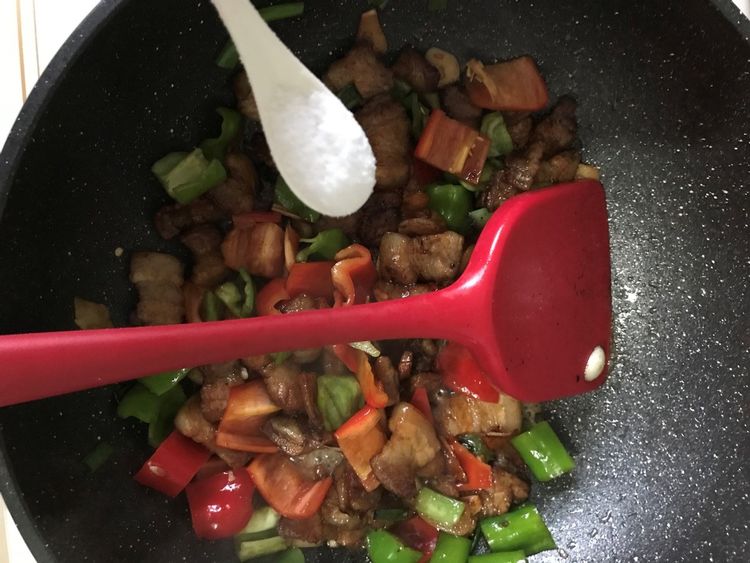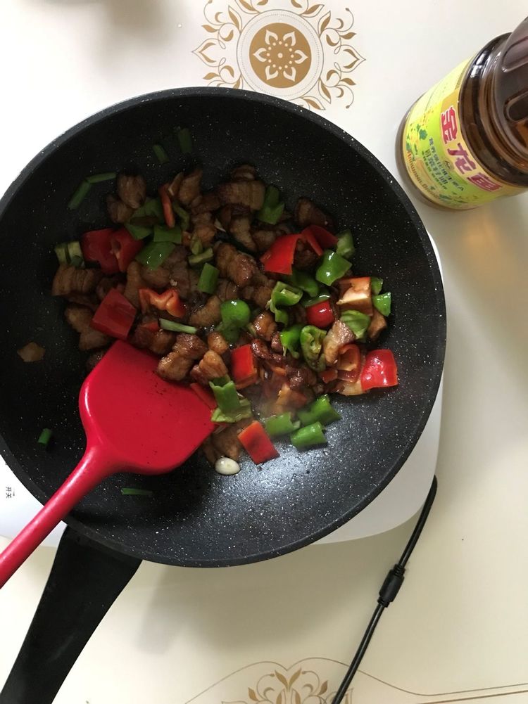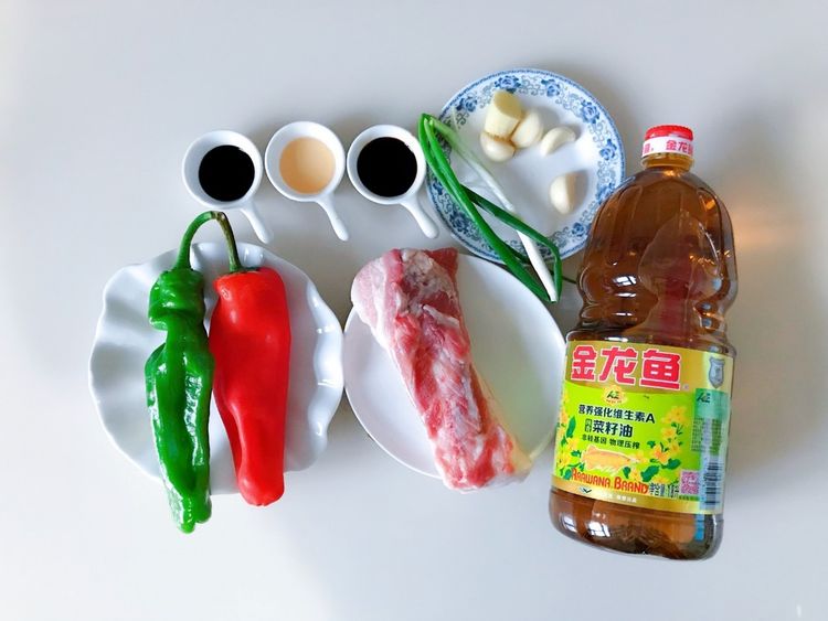 配料:五花肉,青椒,红椒,鸡精,蒜瓣,小葱等
