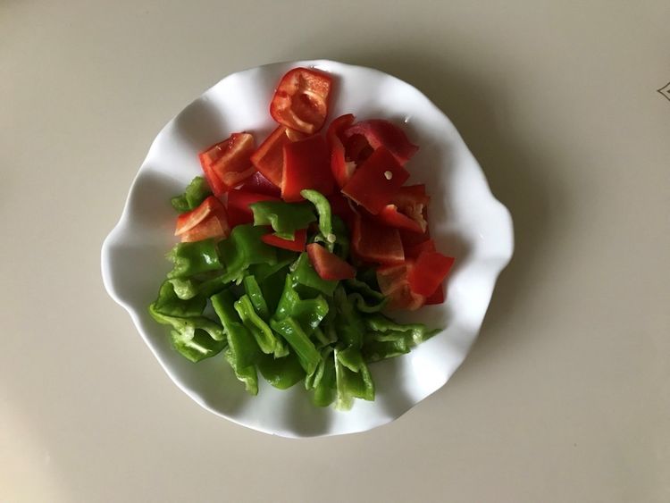 3、青红椒也要各准备一个,去蒂和籽之后要分别清洗干净,再切成辣椒块备用。辣椒块的大小和肉片是差不多的。