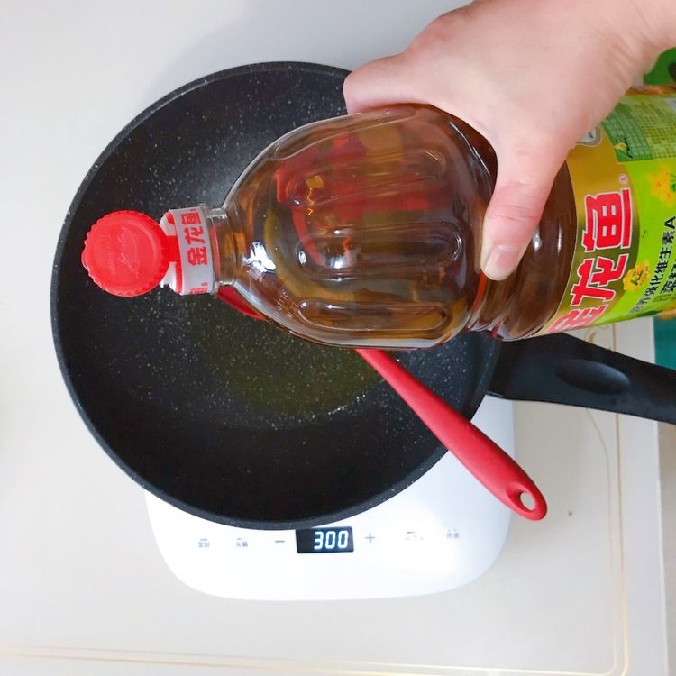 5、准备好不粘锅,在锅里加入少量的油,用菜籽油也是可以的。