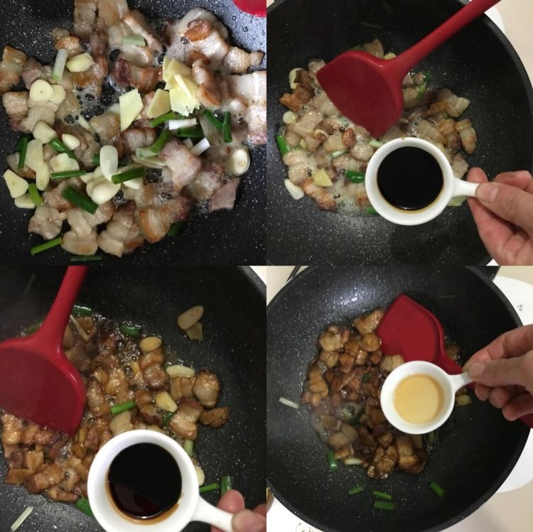 2、一定要放葱姜蒜,可以去掉五花肉的油腻,炒出来的味道也是更香,吃起来的口感更好。