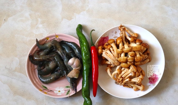食材准备:滑子菇400g,鲜虾250g,青辣椒一个,红辣椒一个,盐适量,生抽半勺,地瓜粉半勺,料酒一勺,生姜一小块,大头蒜两瓣