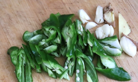 Step2:青红辣椒洗净之后斜刀切好,大头蒜拍扁不用切,生姜洗净切片。