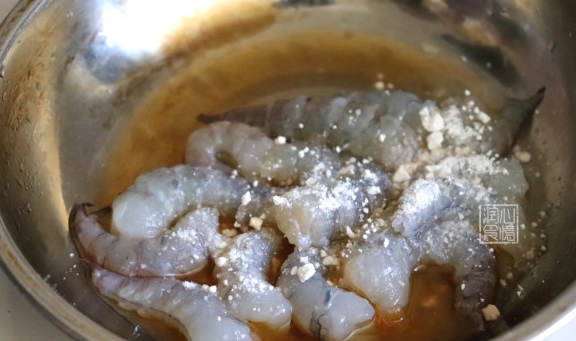 Step3:虾仁去虾头和虾壳,去掉虾线洗净之后放入一个碗里,加入料酒和地瓜粉抓拌均匀。