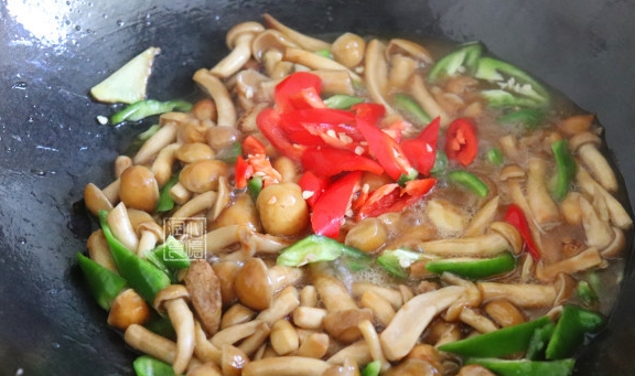 Step6:滑子菇炒至断生之后,把青辣椒和红辣椒倒入锅里翻炒均匀。