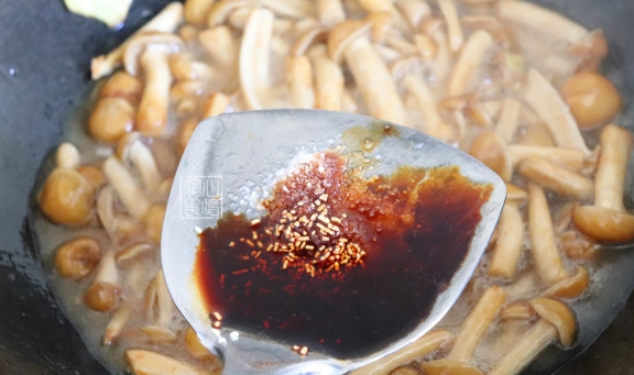 Step5:炒至滑子菇里的水分出来之后,锅里加入食盐、生抽、鸡精,先给滑子菇调个味,煮久一些滑子菇吃着才足够入味。