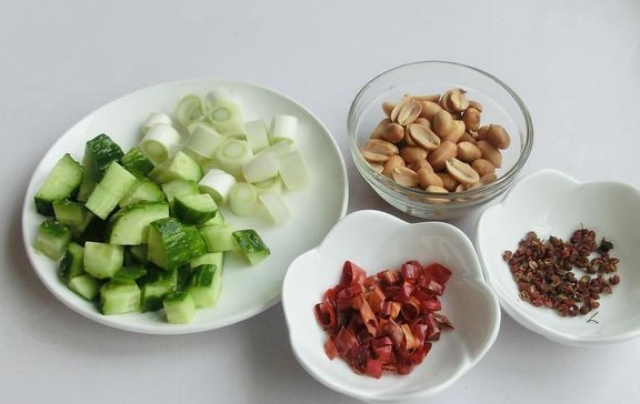材料:鸡脯肉400克、黄瓜100克、熟花生100克。