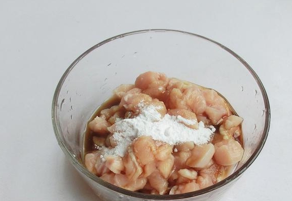 2、鸡胸肉切丁,放生抽、盐、料酒码味,用水淀粉1勺拌匀。最后表面可放点食用油抓匀