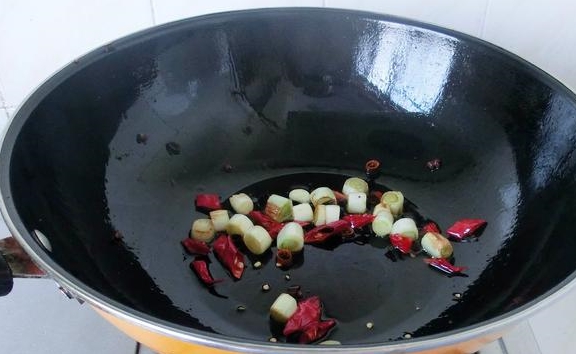 4.锅中留底油,烧热后将花椒和干辣椒放入,用小火煸炸出香味,随后放入大葱段。
