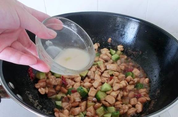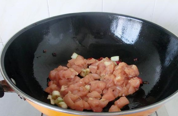 5.放入鸡丁,放1勺料酒,炒到鸡肉变色