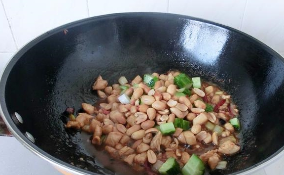 7.最后再放入黄瓜丁、熟花生米,翻炒均。