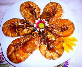 2、坐锅放油、姜,虾用油煎后,烹料酒,加汤、盐、糖、味精、醋,用手勺轻砸虾头,出红油,火靠熟透,汤汁发粘红亮,转锅翻个,打明油,出锅即可食用。