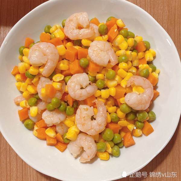 食材:虾仁20个左右,三色蔬菜(玉米、胡萝卜、青豆)也是直接买配好的,蒜两瓣,姜一片,生抽两勺,蚝油一勺,淀粉一勺,盐2克